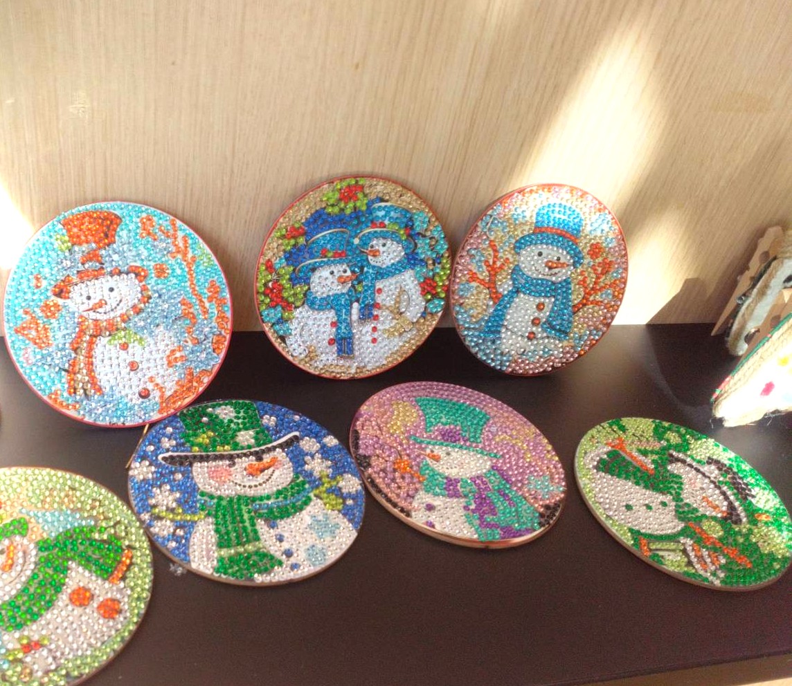 ジンジャークッキーみたいなクリスマスツリーは、ペーパーフラワーと同じく、アルミカップのあいだに入っている紙を集めて色をつけました! 雪だるまは、ダイヤモンドアートです。 利用者さんたち、どれもすごく器用!